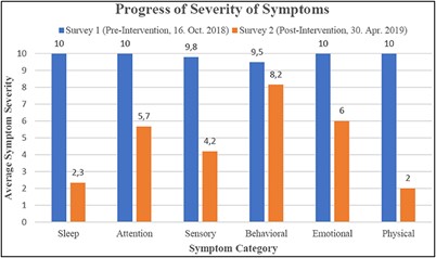 A five-year-old boy with ASD underwent 26 training sessions at a single placement over the course of six months. Strong improvements were documented in comprehensive symptom tracking, with the notable exception of behavioral symptoms, where improvement was a mere 15%. Overall improvement was 50% with respect to pre-training values. Pre-post results in terms of symptom severity are shown in the Figure.